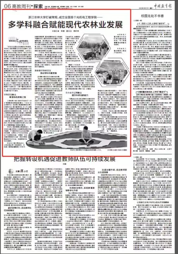 3月27日,《中國教育報》以《浙江農林大學打破常規,成立全國首個光機電工程學院——多學科融合賦能現代農林業發展》為題,在高教版頭條報道了我校光機電工程學院通過多學科交叉融合,為現代農林業發展提速賦能的創新做法。