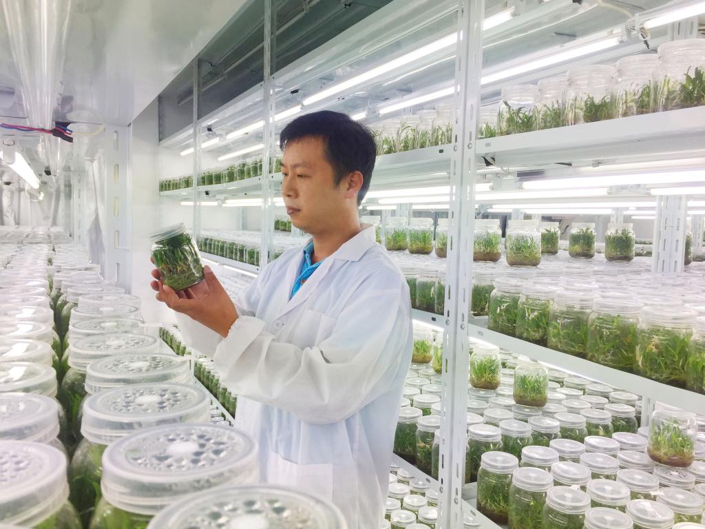 春日的陽光灑滿了整個溫室。一位工作人員穿著白大褂,低頭仔細觀察著鐵皮石斛的生長情況。他輕輕撫摸著一株小苗,手指緩緩地按摩著莖部,感受著莖的柔韌,看著它緩慢但又堅強的生長點,仿佛正在試圖抵抗周圍環境的壓力。他又拿起一個放大鏡,仔細地觀察著葉子上的細節,生怕錯過任何一個細微的變化。他知道,只有細心呵護和精心照料下,這些鐵皮石斛才能更加茁壯成長。
