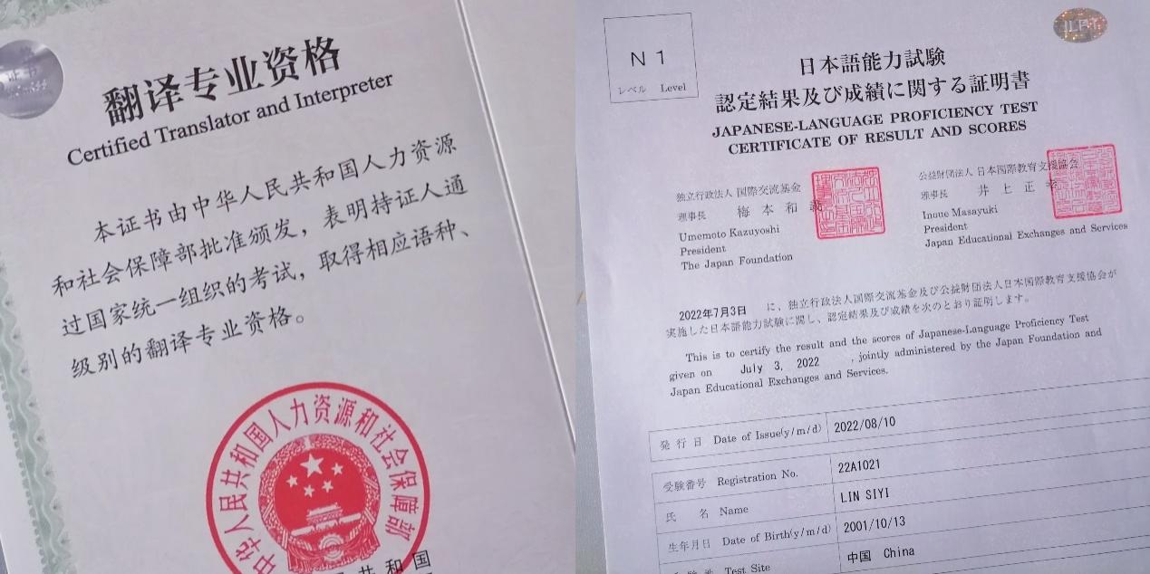 林思懿是個沉穩(wěn)的姑娘,平時參加各種活動不多,喜歡默默無聞地做喜歡的事情,而且做任何事情都喜歡腳踏實地。因為愛好英語、日語,她嘗試著參加相關(guān)的比賽,并先后獲得“外研社·國才杯”全國英語閱讀大賽三等獎、CATTI杯全國翻譯大賽大學(xué)A組中日筆譯三等獎,成功通過日本語能力測試N1、全國翻譯專業(yè)資格考試三級筆譯。