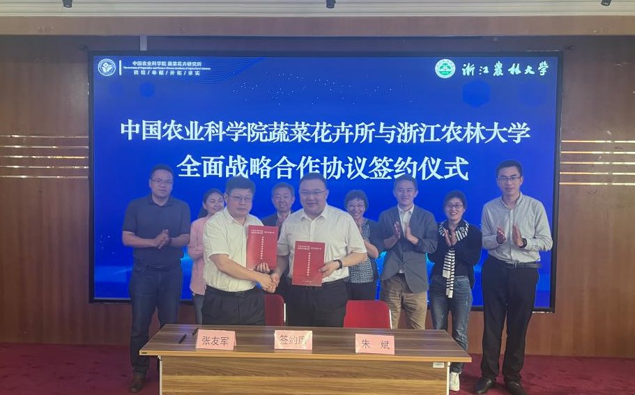 中國農(nóng)科院蔬菜花卉所所辦(人事處)、科技處,我校校辦、研究生院、科技處、園藝學(xué)院等單位負責(zé)人參加簽約儀式。