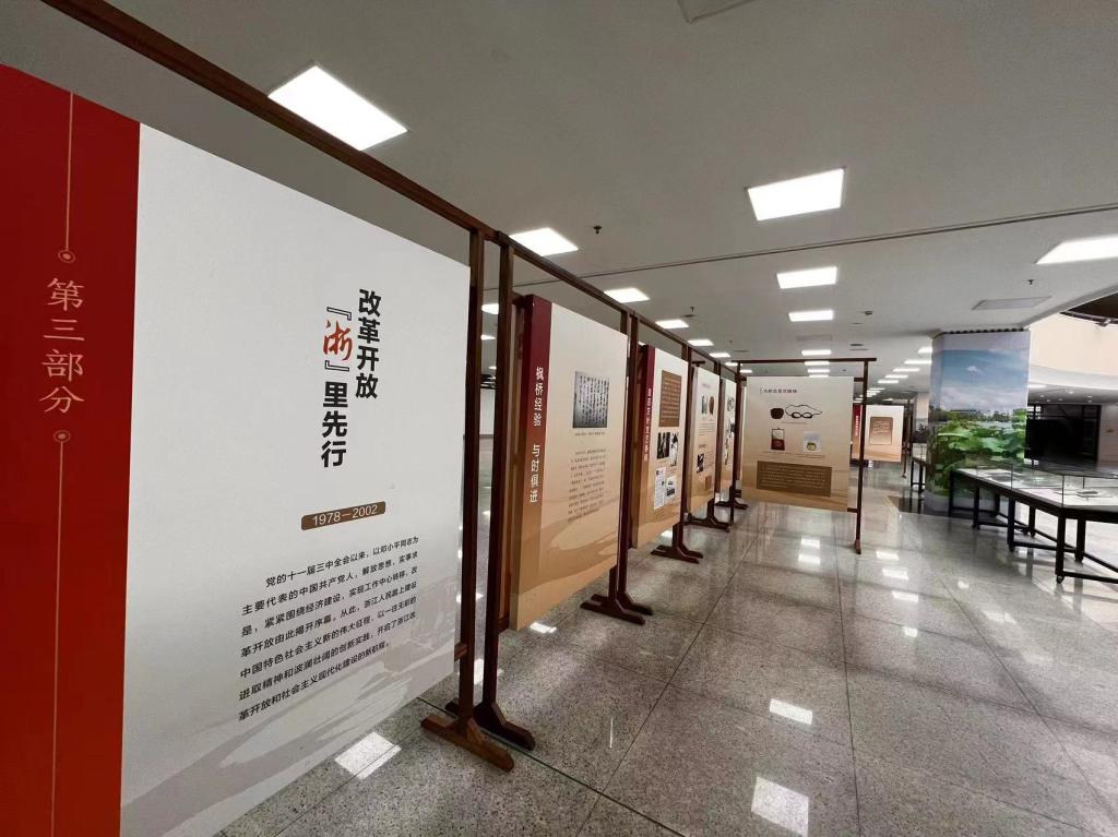 參加展覽的領(lǐng)導(dǎo)嘉賓和師生代表在學(xué)生講解員的引導(dǎo)下步入展廳,參觀展品和各項(xiàng)展陳。一件件革命文物、一張張歷史圖片、一段段文字描述,跨越時(shí)間的長(zhǎng)河,生動(dòng)地將黨史呈現(xiàn)在大家面前,通過(guò)文字展板、歷史圖片、文物展品、數(shù)字展覽相結(jié)合的方式,在展覽中大家真切感受到了浙江作為中國(guó)革命紅船起航地、改革開(kāi)放先行地、習(xí)近平新時(shí)代中國(guó)特色社會(huì)主義思想重要萌發(fā)地在百年黨史中的重要地位。