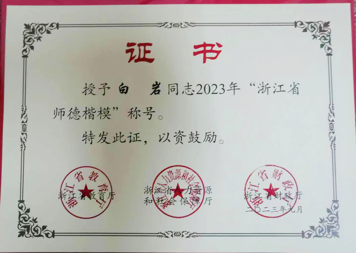 近日,浙江省教育廳、浙江省人力資源和社會保障廳、浙江省財政廳公布2023年“浙江省師德楷模”獲得者名單。我校白巖老師榮獲“浙江省師德楷模”稱號。