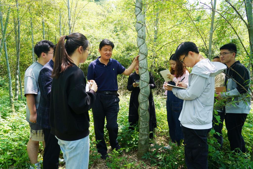 浙江農林大學的學生在校園竹林里,跟著指導老師學習了解各種珍稀竹子品種及相關習性。