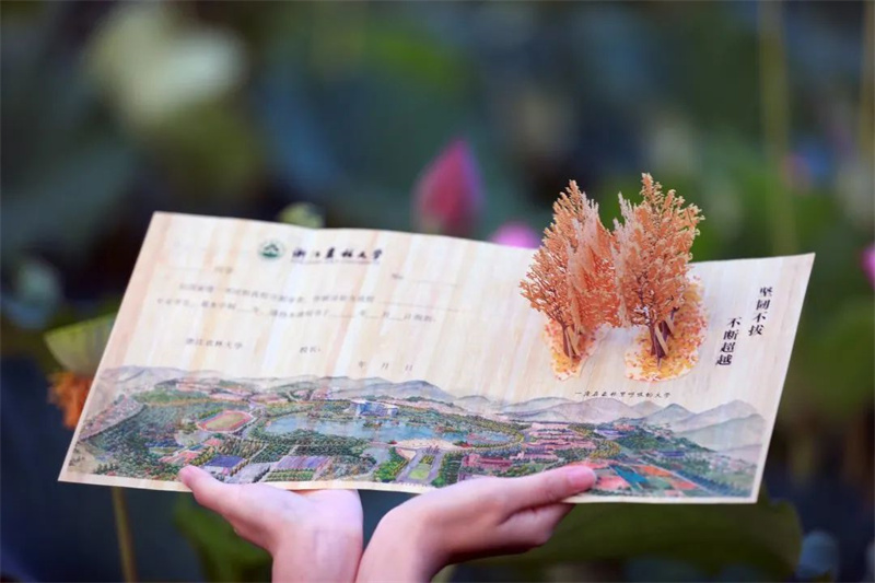 以刨切微薄竹為原料制作,運用學校自主研發的刨切微薄竹技術制作印刷,浙江農林大學2022版錄取通知書堪稱該校“史上最有科技含量的錄取通知書”。