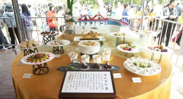 臨安竹筍宴、湖光翠竹宴、錢王家宴、天目暖鍋宴、臨安宴……在竹筍宴展示區(qū),來(lái)自學(xué)校所在地臨安的6家知名餐飲企業(yè),以竹文化元素素材為背景,以筍為食材,運(yùn)用現(xiàn)代烹飪技術(shù)和加工工藝,以炒、蒸、熘、煮、爆、燜、燴等多種方式,輔以各種葷素原料,制作 6 桌全筍宴,每桌都有同學(xué)為大家進(jìn)行講解。