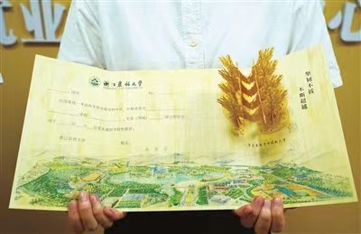 自2015年開始,浙江農林大學錄取通知書一直以毛竹為原材料,運用該校自主研發的刨切微薄竹技術制作印刷,每年融入新的專利技術、不斷迭代升級,相關技術獲8項國家專利,曾獲國家技術發明獎二等獎,被稱為“史上最有科技含量的錄取通知書”。今年新升級的2023版錄取通知書,使“科技”錄取通知書不僅具備較強時尚科技感,更增添了獨特的生態校園文化韻味。