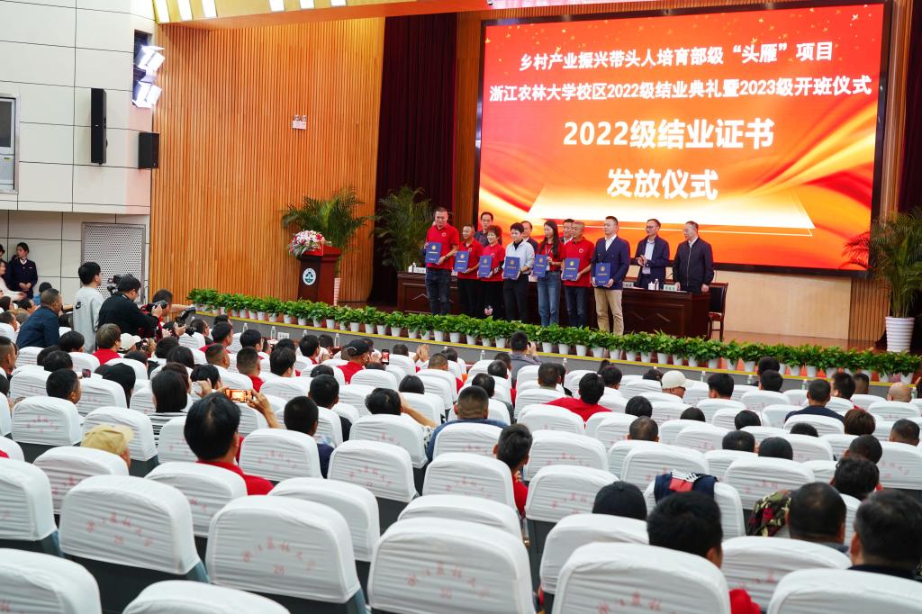 當天,在浙江農林大學進行了一年時間的學習提升后,200名2022級“頭雁”項目學員順利“出師”。他們曾經是農民專業合作社理事長、家庭農場主、農村集體經濟組織負責人、社會化服務組織負責人、市縣級農業產業化龍頭企業負責人及種養大戶,結業后將回到農村,發揮在大學里學習到的各方面知識,加強協同互助、結成鄉村產業振興的“雁陣”,為鄉村全面振興發揮引領示范作用。