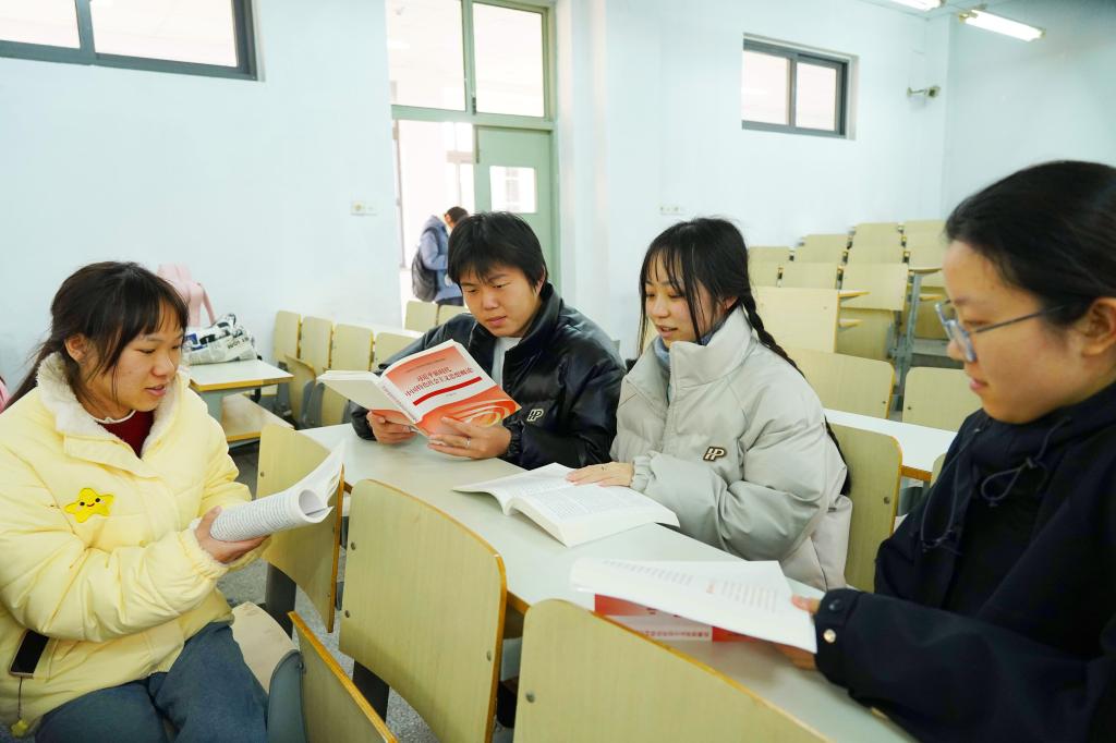 圖③ 12月25日,浙江農林大學東湖校區教學樓里,幾名學生在教室里交流學習《習近平新時代中國特色社會主義思想概論》的體會。陳勝偉 攝