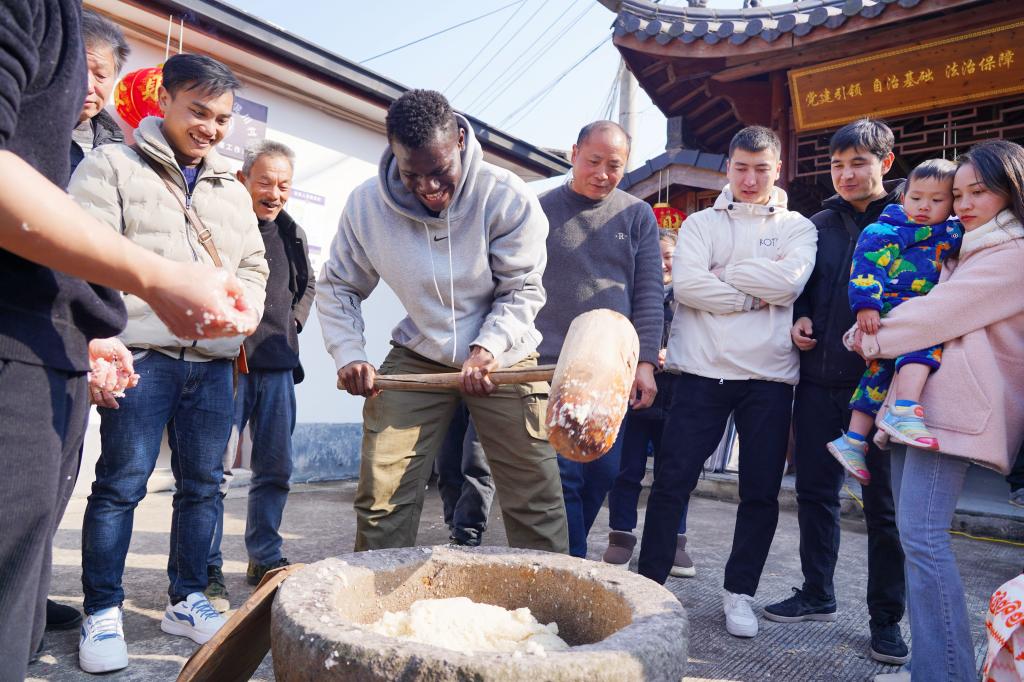 1月28日,浙江農林大學30多名來自10多個國家的留學生,來到杭州市臨安區錦北街道的泥川村,和當地村民一起剪窗花、寫春聯、掛燈籠、炒花生、打麻糍、包餃子,他們還向村里的非遺傳承人學習敲龍鼓、制作龍圖發糕,提前感受濃濃的中國傳統年俗文化。
