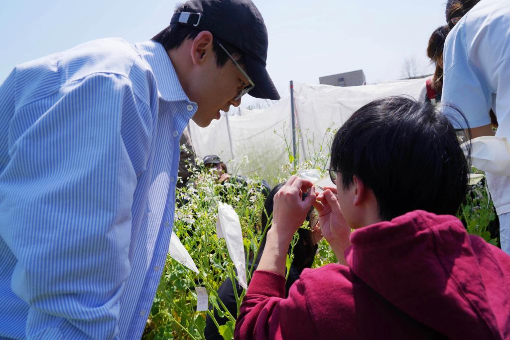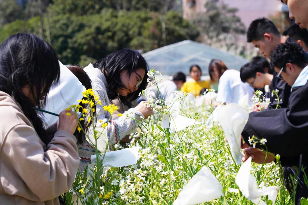 2024年3月23日,浙江農林大學校園農作園,該校學生在田間地頭開展異花授粉方面的實驗研究。