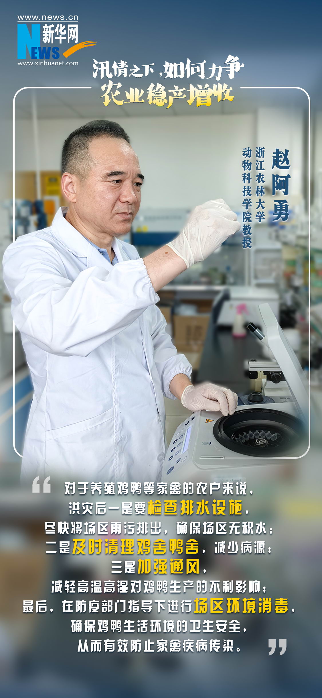 由于持續(xù)暴雨的影響,溫度、濕度都發(fā)生了變化,雨污集聚增加,為病菌滋生和傳播創(chuàng)造了條件,容易引發(fā)家禽生病甚至瘟疫。對于養(yǎng)殖雞鴨等家禽的農戶來說,洪災后一是要檢查排水設施,盡快將場區(qū)雨污排出,確保場區(qū)無積水;二是及時清理雞舍鴨舍,減少病源;三是加強通風,減輕高溫高濕對雞鴨生產的不利影響;最后,在防疫部門指導下進行場區(qū)環(huán)境消毒,確保雞鴨生活環(huán)境的衛(wèi)生安全,從而有效防止家禽疾病傳染。