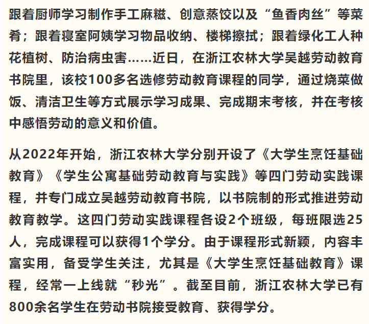 浙江農林大學的吳越勞動教育書院,總面積約1100平方米,共分綜合服務區、理論教學、成果展示、實踐操作四個功能區,強化以學生勞動思政教育、勞動實踐教育為中心,通過教學改革,真正把勞動教育納入人才培養全過程,促進學生形成正確的世界觀、人生觀、價值觀。