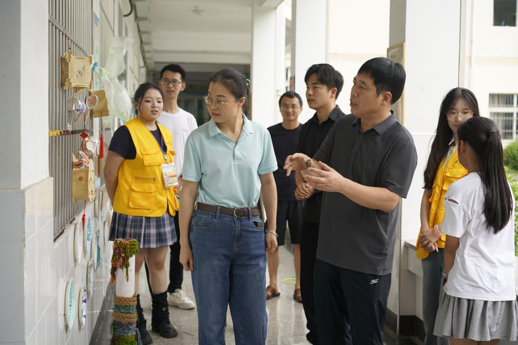 黃曉芳一行參觀了“藝術+”彩虹課堂成果展,彩虹課堂的湍口鎮小學學生代表為大家介紹了同學們在課程中制作的手工扎染、水彩畫作、剪紙作品等。黃曉芳充分肯定了“藝術+”彩虹課堂的教學成果,代表學院黨委對暑期社會實踐團隊成員表達慰問,希望同學們以本次實踐為基礎,拓展實踐形式、總結實踐經驗,形成“藝術+”美育實踐品牌。