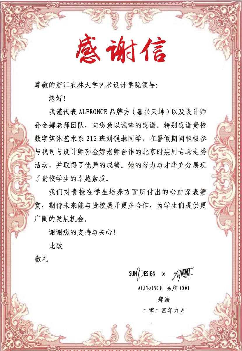 在信中,嘉興天坤設(shè)計(jì)公司表示,數(shù)字媒體藝術(shù)專業(yè)212班劉鎂琳同學(xué)在暑假期間積極參加該公司合作項(xiàng)目,展現(xiàn)了優(yōu)異的專業(yè)能力和創(chuàng)新思維,在北京時(shí)裝周走秀專場(chǎng)幫助品牌方取得了優(yōu)異的成績(jī)。