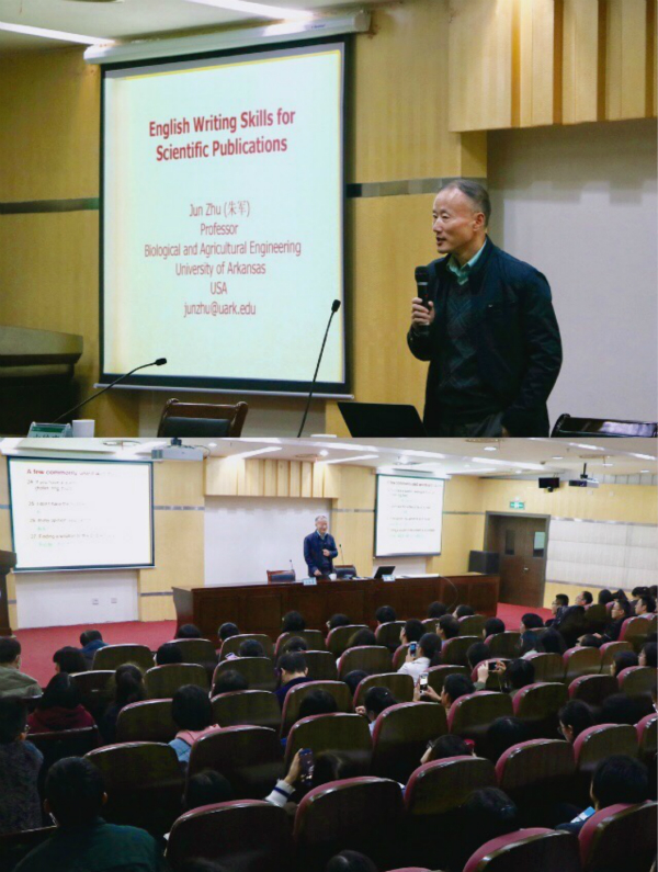 為營造濃厚的學術文化氛圍,提升研究生英語科技論文寫作水平,10月24日,第十期“研途有約”——英語科技論文寫作技巧講座舉行。美國阿肯色大學農業部所屬農村地區可持續發展中心主任朱軍教授受邀主講,研究生院相關負責人主持。