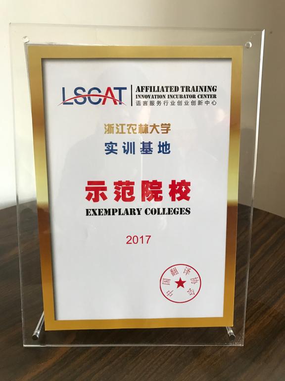 大會為在2017年度中國翻譯協會LSCAT項目中成績卓越的學校頒發榮譽證書。中國翻譯協會授予我校“語言服務行業創業創新中心”實訓基地全國示范院校。浙江省僅有兩所高校獲此殊榮。