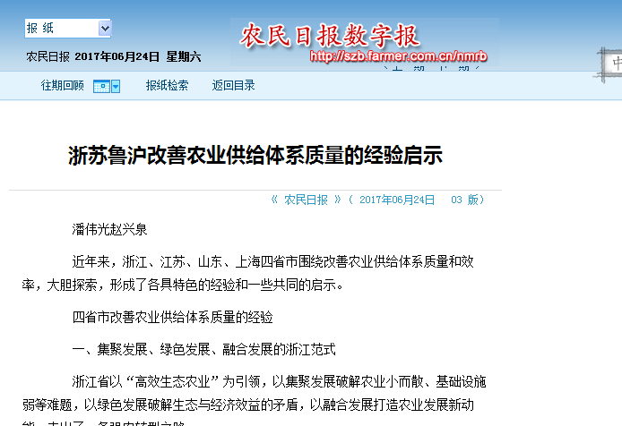 6月24日,《農民日報》以大篇幅刊登我校中國農民發展研究中心常務副主任趙興泉、專職副主任潘偉光的理論文章《浙蘇魯滬改善農業供給體系質量的經驗啟示》。