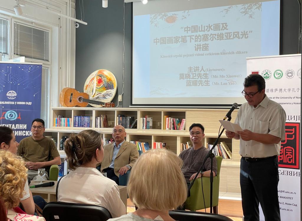 在諾維薩德市中心圖書館,兩位畫家簡(jiǎn)要介紹了中國(guó)山水畫的藝術(shù)特色,現(xiàn)場(chǎng)進(jìn)行了繪畫創(chuàng)作,耐心回答了觀眾們對(duì)中國(guó)畫的好奇和疑問(wèn),提供了寶貴的指導(dǎo)和解答。圖書館館長(zhǎng)亞力山大·馬科維奇(Aleksandra Markanovic)向孔子學(xué)院中方院長(zhǎng)陳晦表示,非常高興中國(guó)知名畫家不辭萬(wàn)里來(lái)到諾維薩德介紹中國(guó)傳統(tǒng)繪畫藝術(shù),以現(xiàn)場(chǎng)呈現(xiàn)的方式讓當(dāng)?shù)孛癖姾蛷V大讀者近距離接觸中國(guó)藝術(shù)和文化,這有助于大家進(jìn)一步了解中國(guó)、增進(jìn)兩國(guó)傳統(tǒng)友誼,更是助推塞爾維亞朋友更多了解中國(guó)及中國(guó)文化的良好契機(jī)。