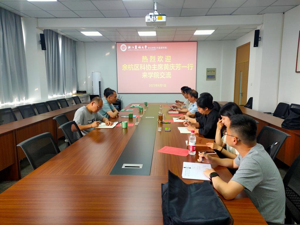 6月1日,余杭區科協主席黃慶芳、副主席黎德峰等一行4人到文法學院交流合作,文法學院黨委書記朱紅東及相關負責人出席座談會,新聞傳播學科負責人、農村發展碩士點導師等參加座談。