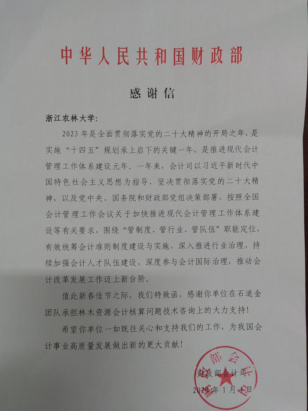 日前,財政部會計司專門給我校發來感謝信。信中高度肯定了經管學院石道金教授團隊在財政部會計司工作中克難攻堅、勇挑重擔,對推進現代會計管理工作體系建設做出的辛勤付出表示了充分肯定,并對我院圍繞中心、服務大局,積極推動會計改革發展工作做出的突出貢獻表達了誠摯謝意。